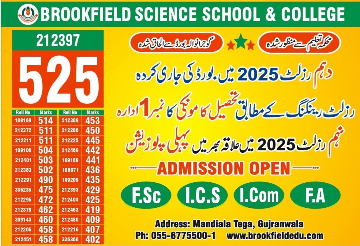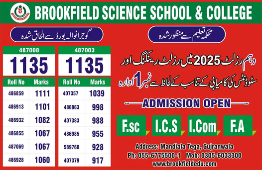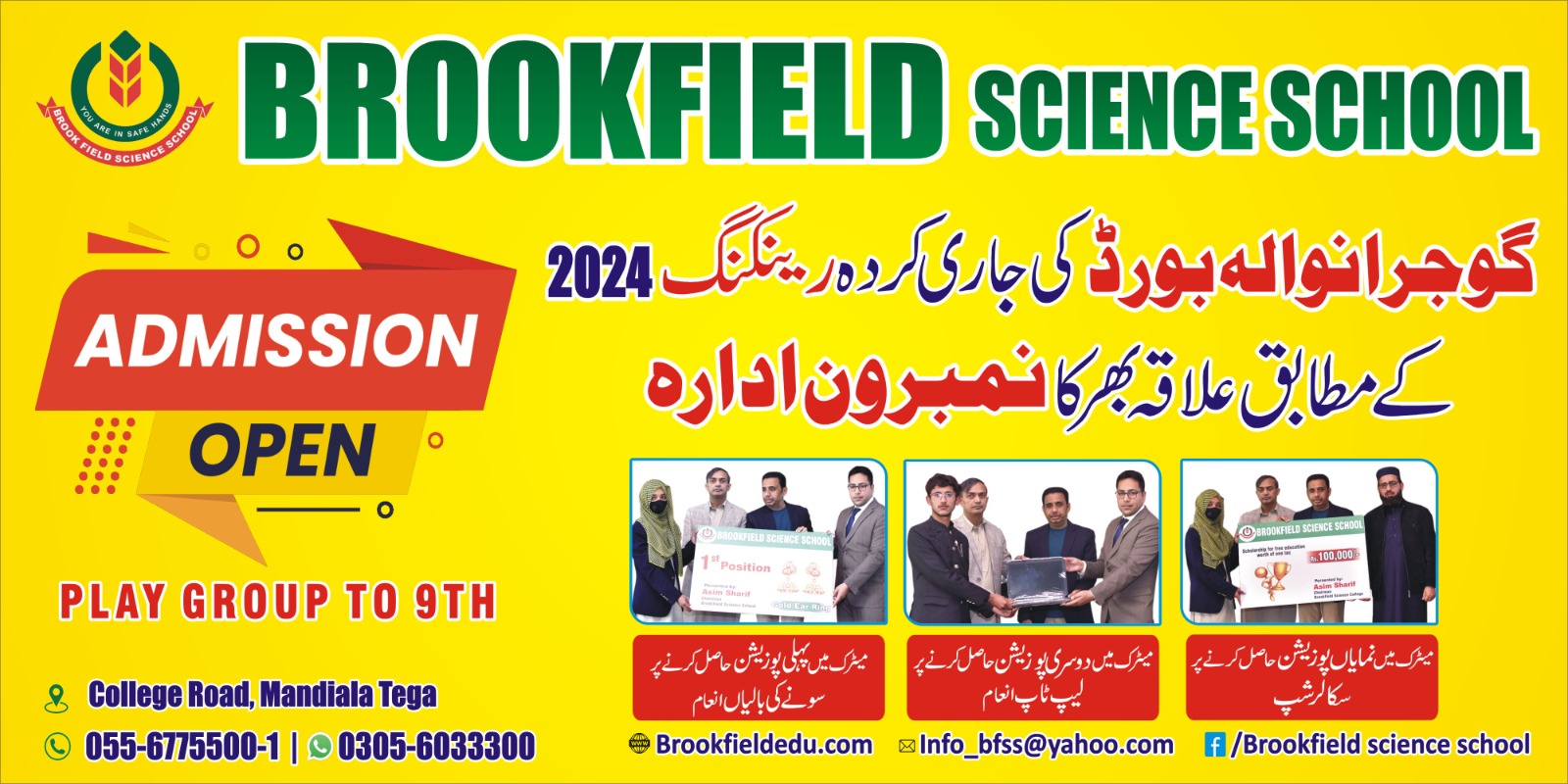 Located in the heart of Mandiala Tega, Gujranwala, Brookfield Science School is one of the region’s most trusted and result-oriented educational institutions. Established in 2013 under the leadership of Chairman Asim Sharif, Brookfield has earned a reputation for academic excellence, discipline, and character building.
